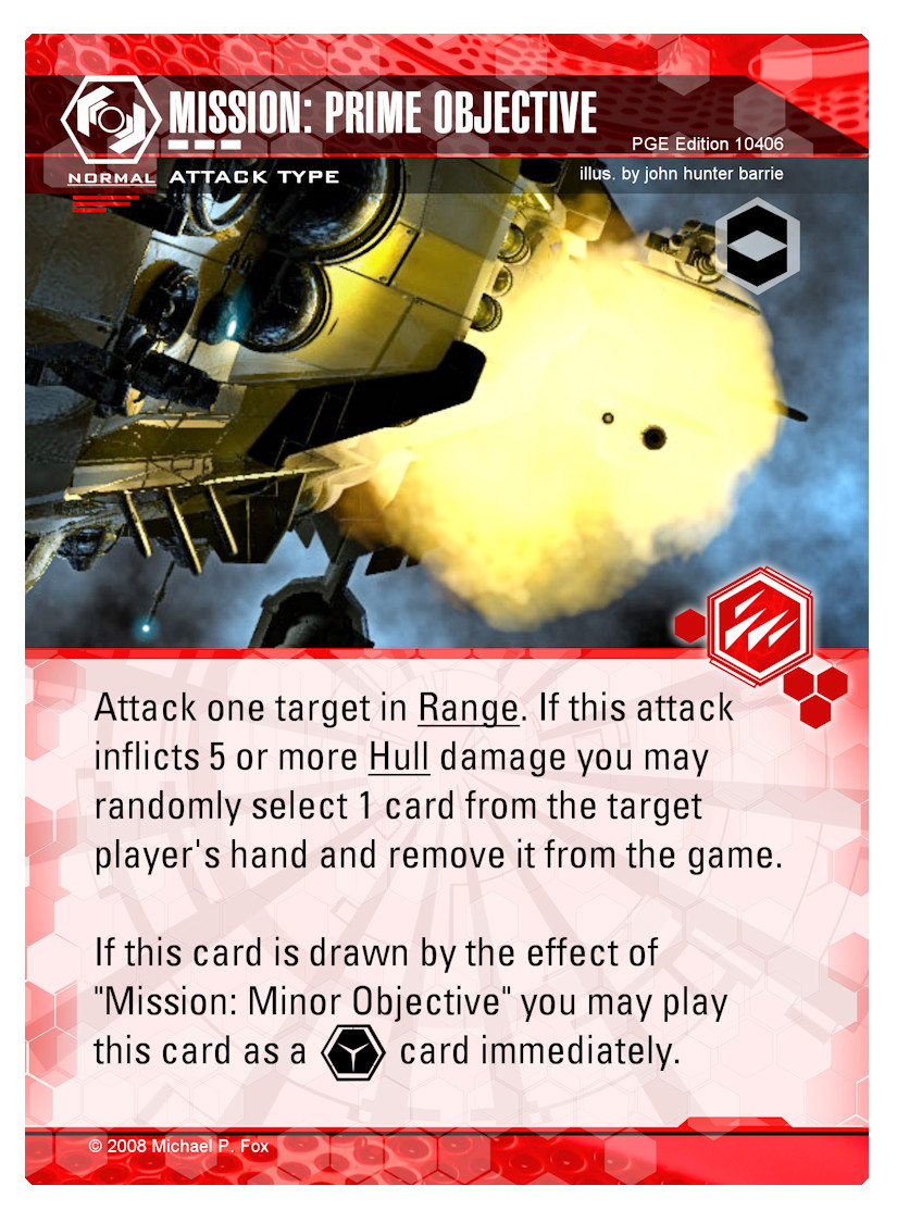 ATTACK cards now feature a Combat Type icon indicating Energy or Projectile attack. ATTACK cards with no combat type icon are considered "objective" attacks. This new dynamic of Dog Fight: Starship Edition makes for lots of new card ideas and styles of game play.